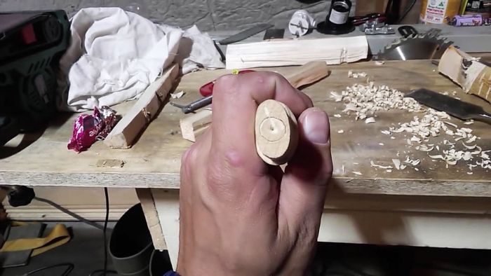 Необходимо подготовить заготовку рукояти к насадке. Для этого сторону с меньшим сечением подгоняем под отверстие в головке с помощью столярного ножа, напильника по дереву или наждачного круга. Посадочная часть рукояти должна свободно без натяга входить в отверстие головки и по длине соответствовать ему.