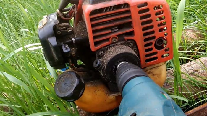Головка надевается на гайку храповика, и дрель запускается. Как только мотокоса заведется, необходимо потянуть дрель на себя, чтобы отсоединить головку.