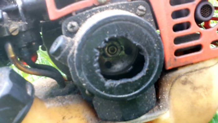 Для запуска двигателя мотокосы необходимо снять стартер для доступа к гайке крепления храповика.