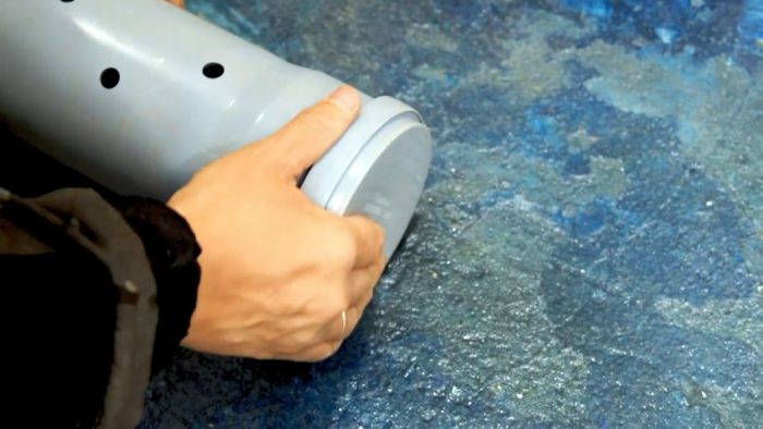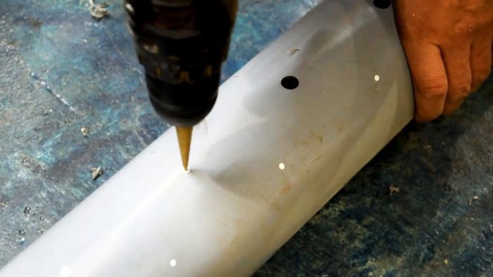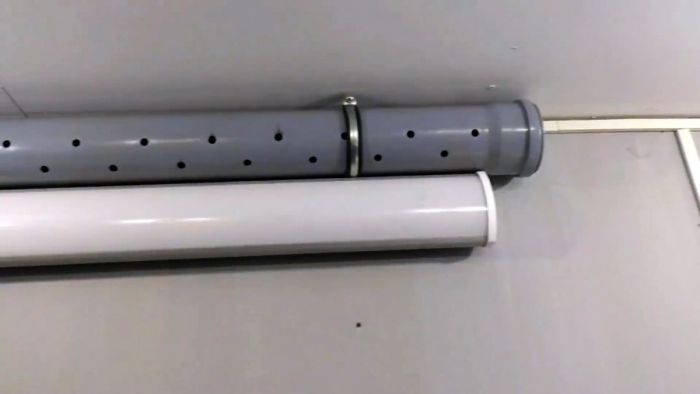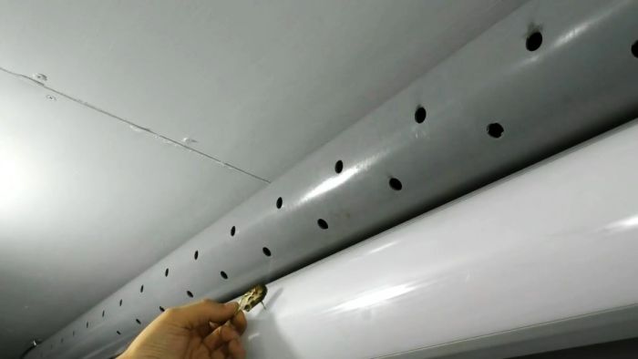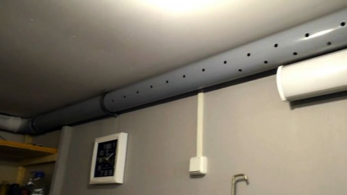 К трубе с вентилятором присоединяется длинная труба. Ее нужно подвести к рабочему месту. Она просверливается большим сверлом в несколько рядов. Ее край закрывается заглушкой.