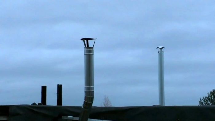 В стене под потолком проделывается отверстие под диаметр трубы. В него заводится короткая канализационная труба и снаружи соединяется с коленом. К колену присоединяется вертикальная труба и закрывается козырьком от осадков. Чем выше она получится, тем лучше будет выходить воздух с дымом естественным способом без включения вентилятора.