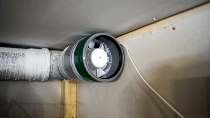 Вентилятор в трубе закрепляется с помощью резинового уплотнителя или же саморезом. На него подается питание через клавишный выключатель.