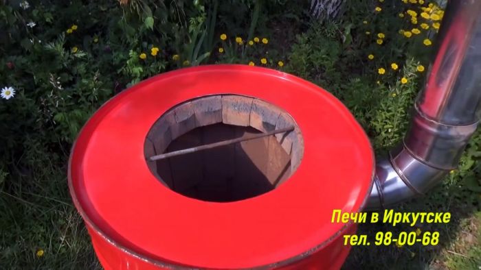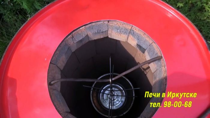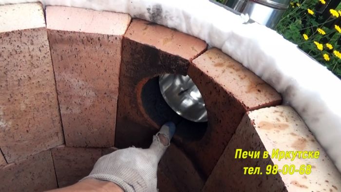 Сверху укладывается второй слой, но уже обычного печного кирпича. Затем стенки бочки утепляются базальтовой ватой или другим утеплителем для каминов и печей.