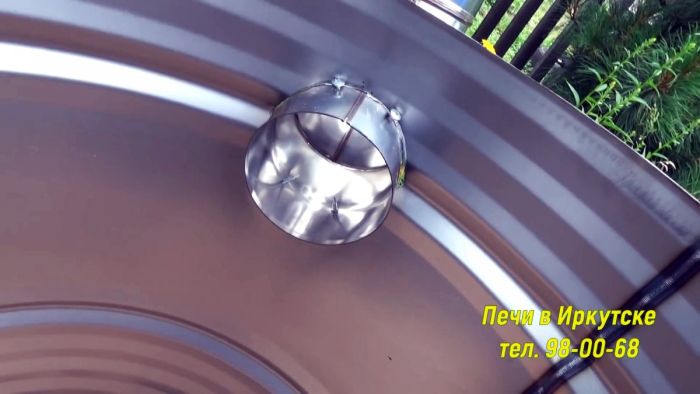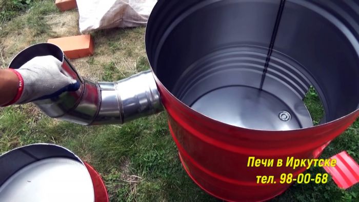 В верхней части бочки сбоку или напротив поддувала прорезается окно дымоход. В него вставляется колено и закрепляется саморезами. Высота вставляемой в колено трубы дымохода должна быть выше уровня глаз, чтобы дым не мешал.