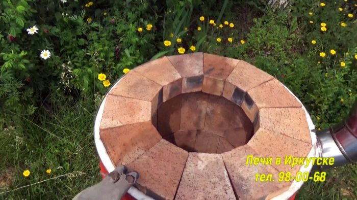 Далее необходимо заложить стенки бочки печным кирпичом. Для этого тот подрезается по углам. Это позволит сложить из него кольцо без раствора. За счет формы кирпич будет сам себя поддерживать. При закладывании поддувала нужно использовать 2 подрезанные кирпича, чтобы его не перекрыть. Аналогично следует сделать и с отверстием для дымохода.
