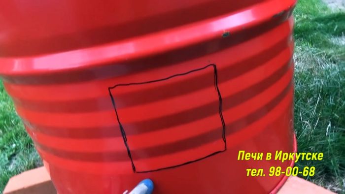 Бочку под тандыр нужно перевернуть вверх дном и сделать разметку под поддувало. С учетом теплоизоляции пода окно под него вырезается на высоте 130 мм. Затем у бочки срезается перевернутое кверху дно так, чтобы общая высота тандыры составила 700 мм. Срезанное дно пока откладывается в сторону, оно позже еще понадобиться.