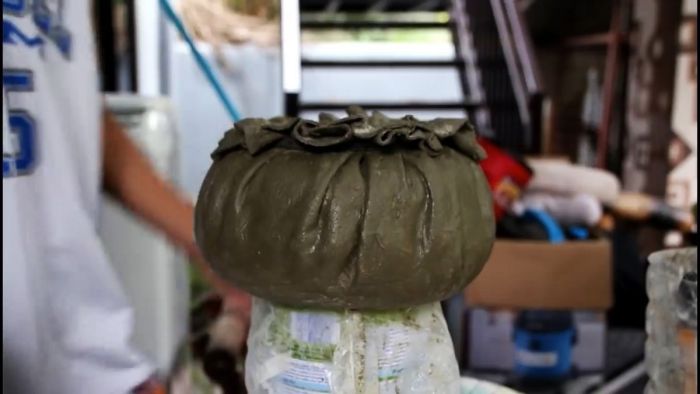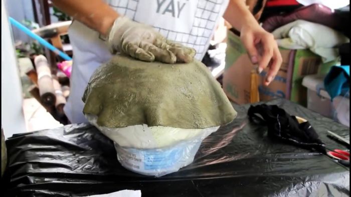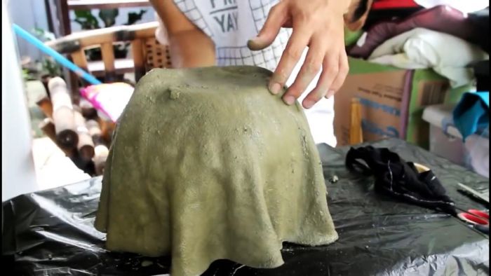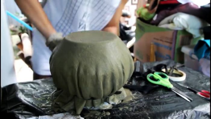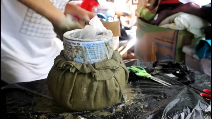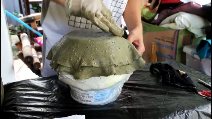 В цементной ванне замачиваются лоскуты ткани. Это может быть старая простыня, футболка или что-то подобное. Достаточно подготовить 3 лоскута. Один из них должен быть такого размера, чтобы перекрывать форму полностью. Остальные делаются поменьше. Лоскуты пропитываются в цементном растворе и укладываются на форму, перевернутую вверх дном. Намотанную на нее ткань нужно расположить в центре.