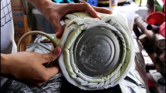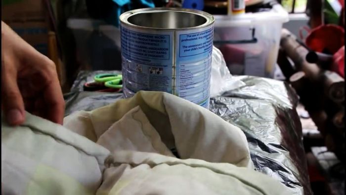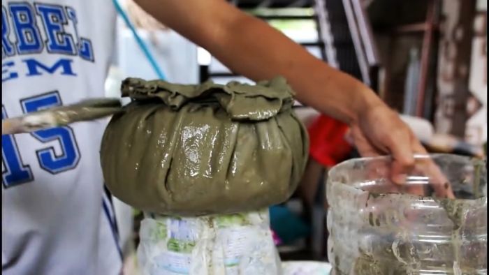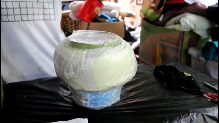 На подобранную емкость снизу у дна нужно намотать любую ткань, чтобы получить расширение. Ее края можно зафиксировать скотчем или умотать ткань нитками.