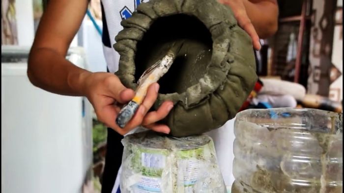На второй день готовится еще раз жидкий цементный раствор. Из заготовки вынимается форма с рулоном расширяющей ткани. Затем она промазывается цементом с помощью малярной кисти. Раствор наносится снаружи и изнутри. Нужно просто скрыть участки с выступающей тканью.