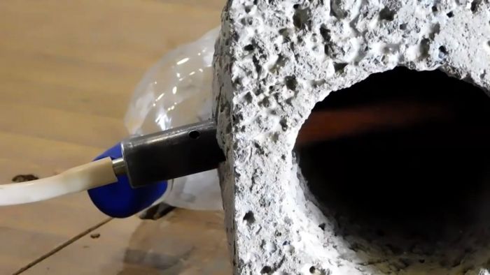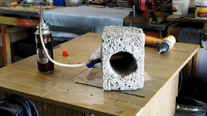 В срезанной части шлакоблока сбоку примерно по центру просверливается отверстие через одну стенку диаметром 20 мм. В него нужно вставить горелку.