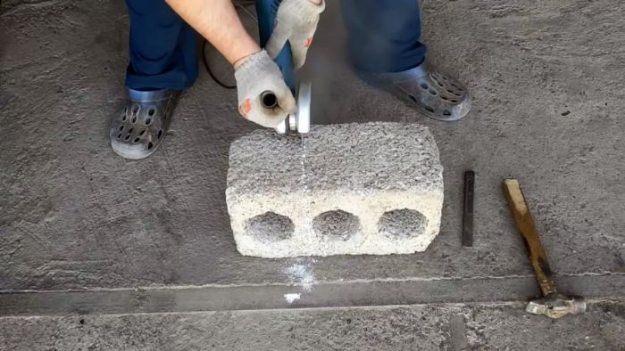 Корпусом горна послужит пустотелый шлакоблок. Только нужен не легкий тонкостенный, а тяжелый для несущих стен. От шлакоблока необходимо отрезать примерно треть. Имеющееся в срезанной части глухое отверстие и будет чашей горна. Лучше, чтобы оно было круглым, но подойдет и прямоугольное.