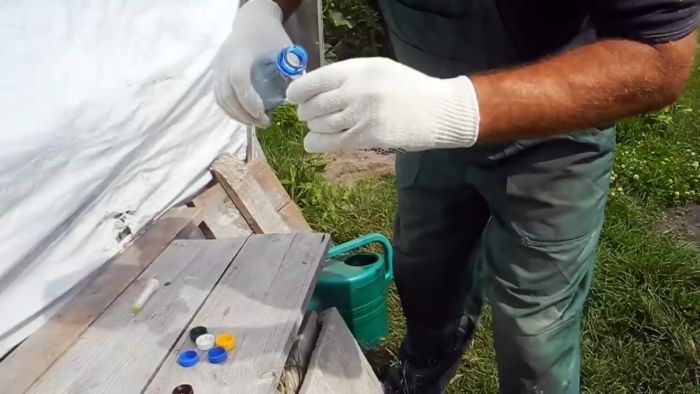 Для этого необходимо приготовить сахарный сироп. В теплой воде растворяется сахар в пропорции 1:1. По сути, требуется просто концентрированный сахарный раствор, варить ничего не нужно. На обработку участка будет достаточно 0,5-1 л сиропа.