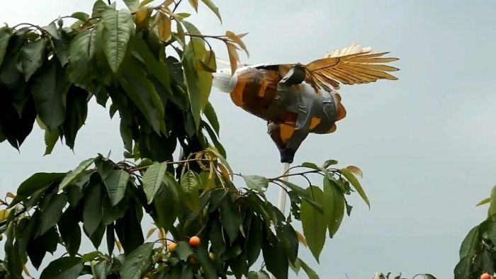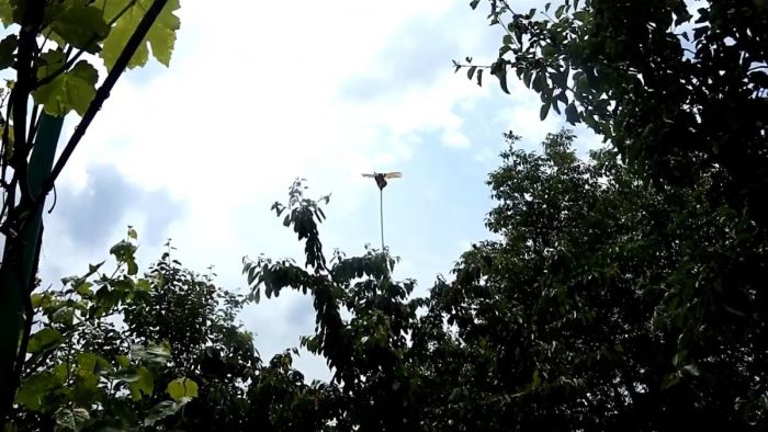 Затем его нужно вставить в землю над клубникой или привязать к веткам выше кроны черешни. При воздействии ветра крылья пугала колыхаются на ветру. Со стороны птицам это напоминает парящего в воздухе хищника высматривающего добычу, поэтому они постараются держаться от него подальше