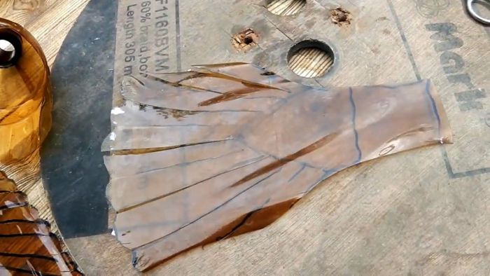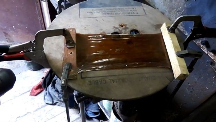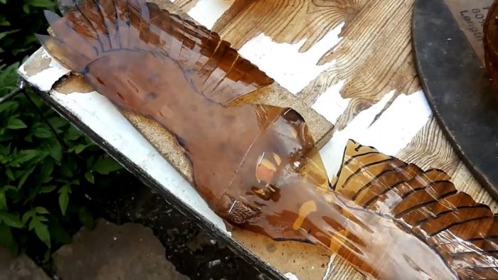 Чтобы сделать хвост и крылья птицы, нужно подготовить 3 листа пластика из бутылок. Для этого у них срезается дно и горловины, после чего полученные трубки распускаются вдоль. Раскроенные бутылки разравниваются и закрепляются на ровном основании по двум краям. Их можно прижать струбцинами через рейку или просто прикрутить саморезами. Затем листы прогреваются монтажным феном. В результате нагрева они приобретают плоскость, и перестают скручиваться в трубу.