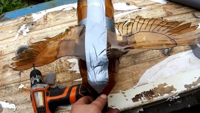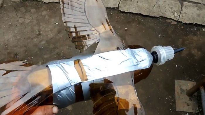 Чтобы сымитировать тело птицы, используется целая бутылка. К ней снизу приклеивается скотчем подрезанная горловина, оставшаяся от изготовления листов. Она послужит основанием для крепления чучела на шесте. Затем скотчем приклеиваются хвост и крылья. Поскольку те не имеют достаточной жесткости, то под них нужно подложить поролон, пенопласт или обрезки утеплителя для труб. Благодаря этому те смогут держать форму и не обвисать.