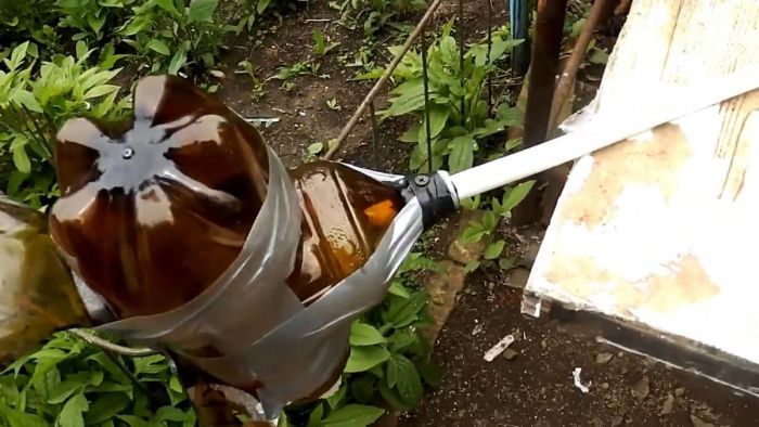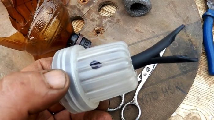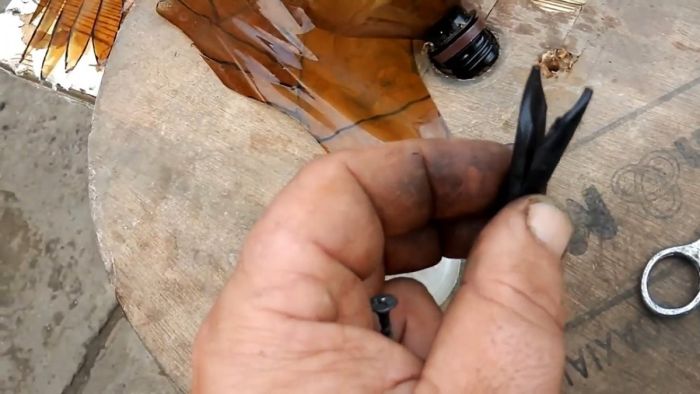 Чтобы сделать голову птицы, необходимо прикрутить саморезом к крышке бутылки служащей телом чучела крышку от ополаскивателя для белья. В последней в торце делается отверстие, в которое вставляется подрезанная вдоль шланга или трубка, длиной 4-5 см.