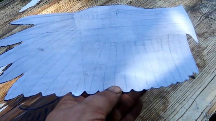 Из подготовленных листов вырезается хвост и крылья пугала. Важно сымитировать перья, чтобы они потом колыхались ветром. Не имея таланта художника, лучше распечатать контуры крыльев и хвоста на листе бумаги, и потом вырезать по ним шаблон.