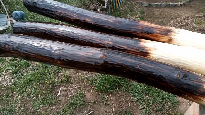Зачищенные от коры части столбов под вкапывание необходимо обжечь до темного цвета. Это создаст первый рубеж от гниения. После этого поверхность пропитывается специализированным антисептиком, если бюджет стройки ограничен, то можно использовать просто раствор медного купороса. Такая пропитка сделает дерево неблагоприятной средой для грибка, плесени и гнилостных бактерий.