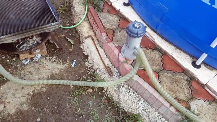 Насос забирает воду из бассейна и подает ее на радиатор.