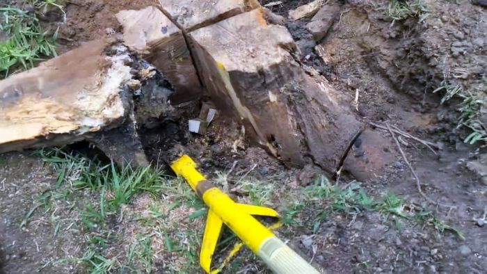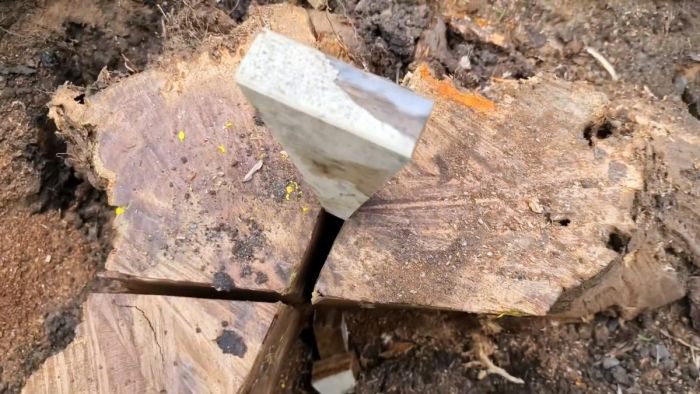 По мере погружения они будут раскалывать дерево. Первые клинья очень быстро разламываются, но когда пень начнет колоться, то остальные пойдут лучше.