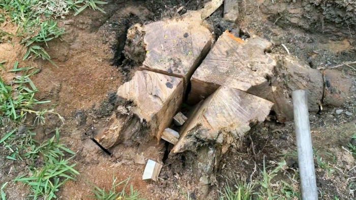 После спила деревьев остаются пни, которые еще долго могут давать поросль и гнить. Если на месте пня нужно сделать клумбу или провести строительство, то его нужно удалить. Чтобы не копать огромный котлован вокруг коряги, лучше расколоть ее клиньями на куски и вырвать их.