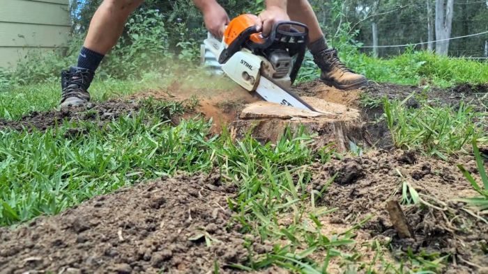 Для полного удаления пня требуется его обкопать, чтобы обнажить толстые боковые корни. Используя бензопилу нужно перепилить видимые главные ответвления корней и разрезать пень вдоль накрест, покуда позволяет длина шины.