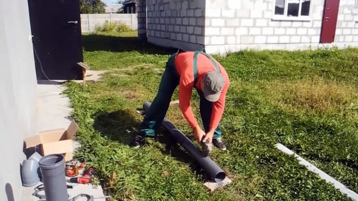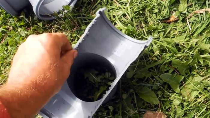 Она тоже разрезается пополам, но только по сторонам с раструбами. Тройник для этой цели не подходит, поскольку его ровное ответвление без раструба никогда не делается перпендикулярно входам. Также пополам разрезаются заглушки. Оставшаяся после реза пластиковая бахрома по разрезам снимается монтажным ножом.
