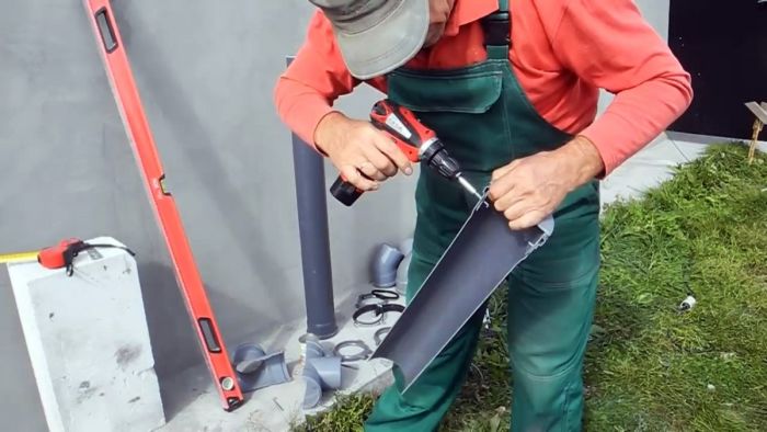 К нижнему выходу воронки присоединяется колено 45 градусов, и затем обычная не порезанная труба. В зависимости от особенностей крыши может использоваться несколько колен, чтобы подвести сток к фасадной стене для возможности его крепления на хомуты. Внизу сточной трубы устанавливается уголок для слива воды в сторону подальше от фундамента.