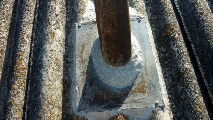 При выводе дымоходной трубы через кровлю остается зазор, который необходимо загерметизировать. Поскольку дымоход нагревается, то обычный цементно-песчаный раствор для этого дела не годится, так как будет растрескиваться. Бюджетно решить проблему можно сделав специальный асбестоцементный раствор, отличающийся высокой температурной устойчивостью.