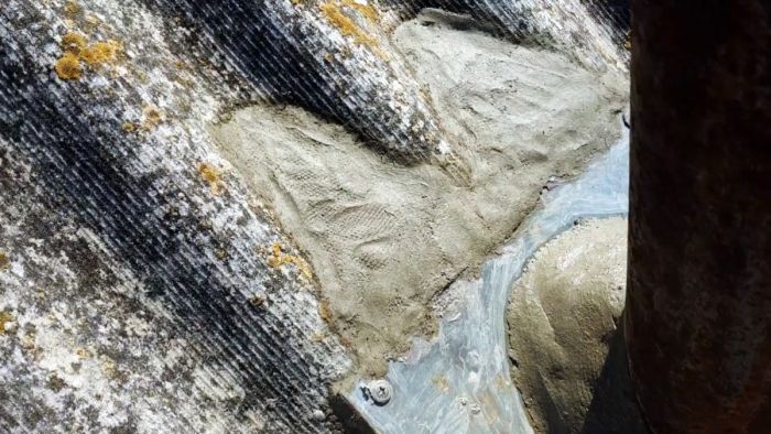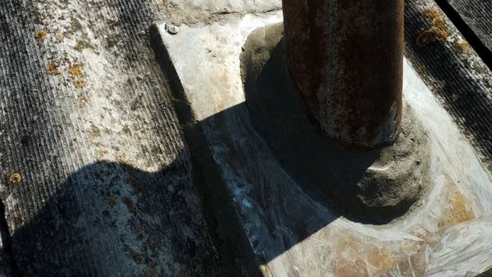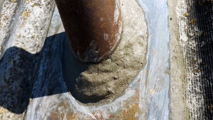 Если делается заделка зазора между трубой и шифером с использованием накладной пластины, то следует также сформировать уклон для ската воды, чтобы осадки не скапливались в волнах перед дымоходом. Перед тем как наносить раствор, нужно счистить грязь и лишайник с шифера, чтобы цемент смог к нему нормально прилипнуть. Сверху состав прилаживается мокрой рукой или смоченной в воде малярной кистью, чтобы сделать поверхность гладкой без открытых пор. Остатки раствора при необходимости можно применить для быстрого ремонта трещин на шифере.