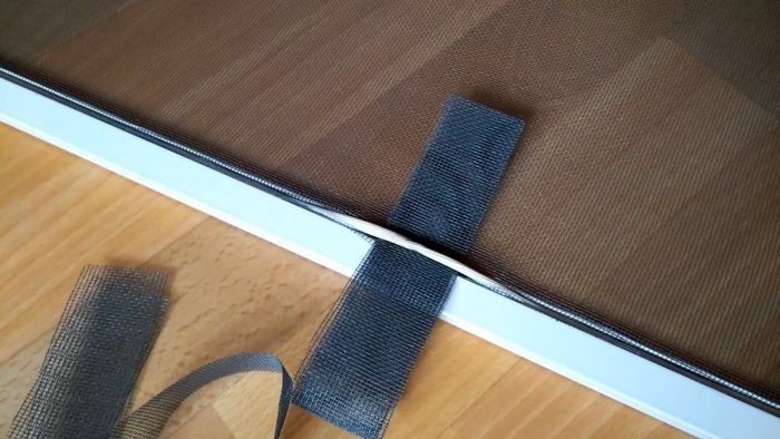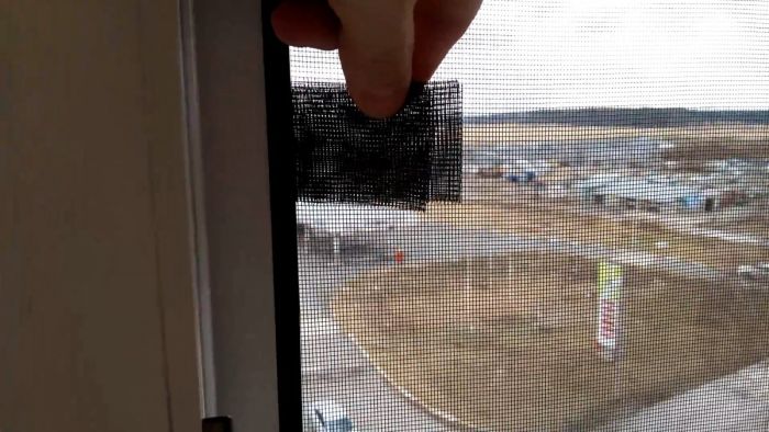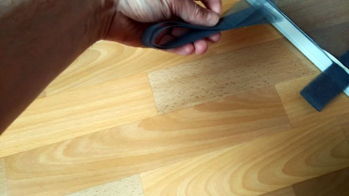 Сетка переворачивается, и выступающая с обратной стороны часть ленты обрезается ножницами. Таким же способом устанавливается и вторая ручка. Ели рамка с сеткой сложно заводится за ограничители на окне, что бывает если она согнулась дугой, то стоит добавить третью ручку снизу. Ее можно делать из ленты сложенной вдвое.