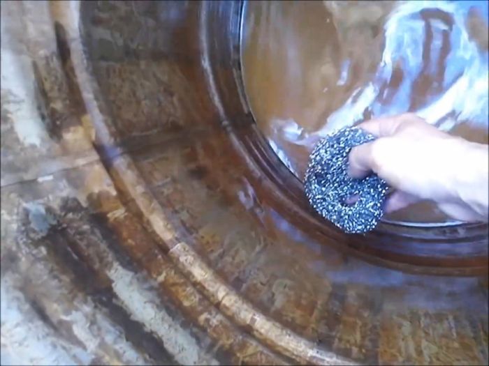 Перед обработкой емкости нужно убрать на ее внутренних стенках ржавчину.