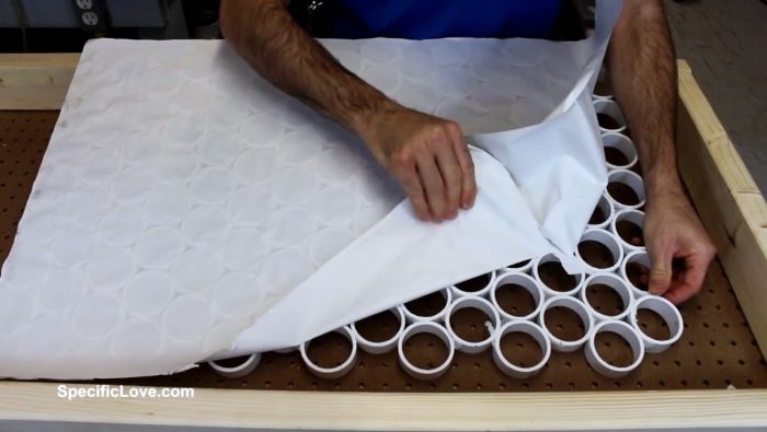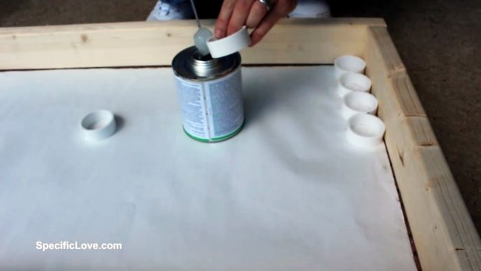 В рамку выкладываются кольца, предварительно смазанные клеем в точках касания друг к другу. Важно использовать качественный клей, рассчитанный специально под работу с ПВХ. Чтобы кольца плотно прилегали до момента схватывания клея, нужно чтобы рамка их ужала. Если ее размер не подошел, то следует уложить вдоль одной продольной и поперечной стороны рейки подходящего сечения, чтобы ужать кольца.