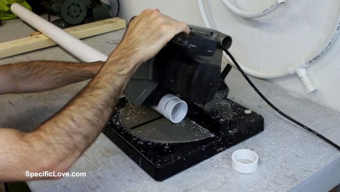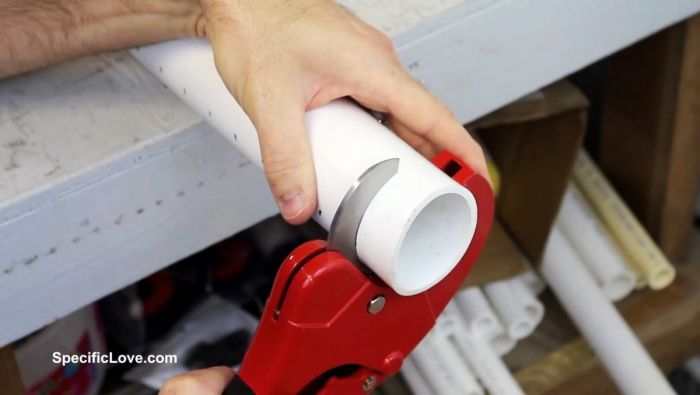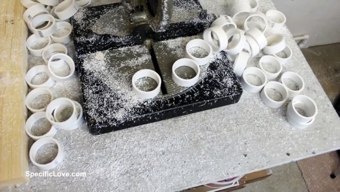 Далее труба разрезается по меткам на кольца. Это можно делать ножницами для пластиковых труб, но если они не фирменные, то через пару сотен резов затупятся, к тому же работать ими сложно.