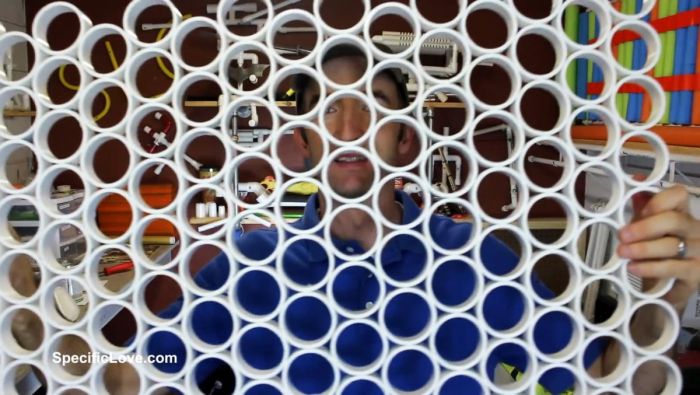 Для украшения интерьеров и экстерьеров можно использовать декоративную решетку, склеенную из ПВХ трубы. Она недорогая в изготовлении, а если после ремонта в наличии имеются короткие отрезки труб, то ее сборка получится практически бесплатной, за вычетом клея.