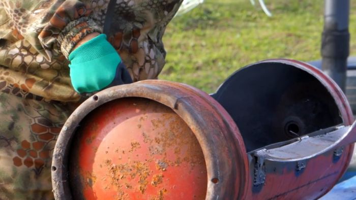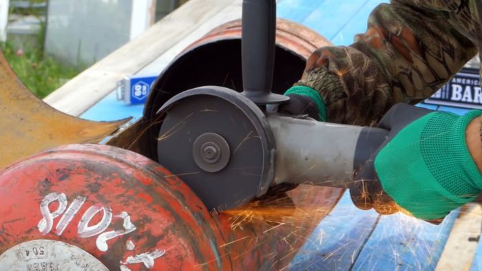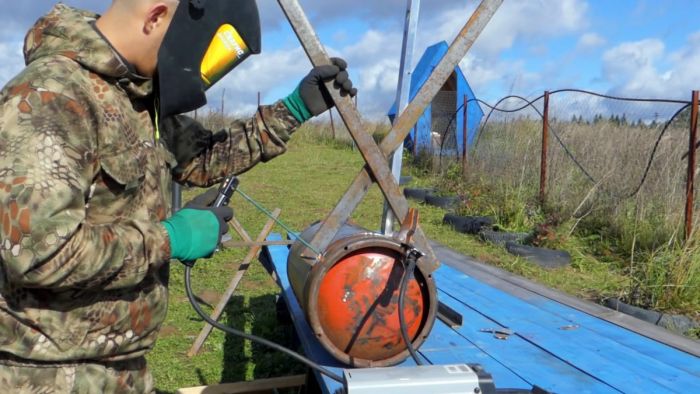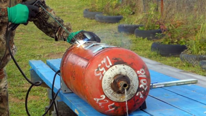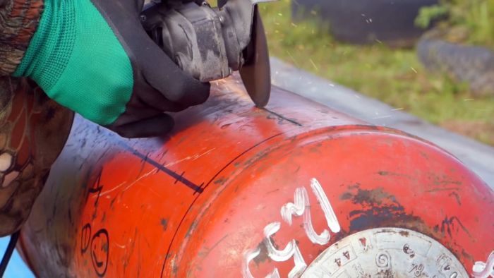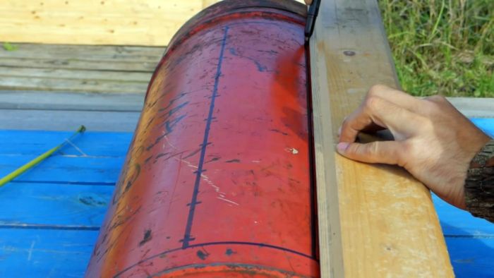 Чтобы безопасно разрезать баллон, нужно открыть его вентиль и стравить остатки газа. Затем он до верха заполняется водой и вентиль перекрывается. Далее требуется сделать разметку под вырез крышки и установку шампуров. Для этого нужно начертить 2 линии параллельно продольному шву баллона, отступив от него по 24 см в обе стороны. Они прорисовываются вдоль центральной части баллона между поперечными швами. По этим линиям будут располагаться отверстия под шампура.