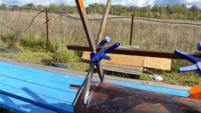 Чтобы облагородить мангал, нужно зачистить его поверхность для лучшей адгезии краски. Со стороны дна к нему привариваются ножки. Для этого используется 4 отрезка профильной трубы длиной по 1 м. Трубы привариваются накрест по 2 шт. Затем между ними вваривается перекладина. При желании можно сразу же сообразить полочку.