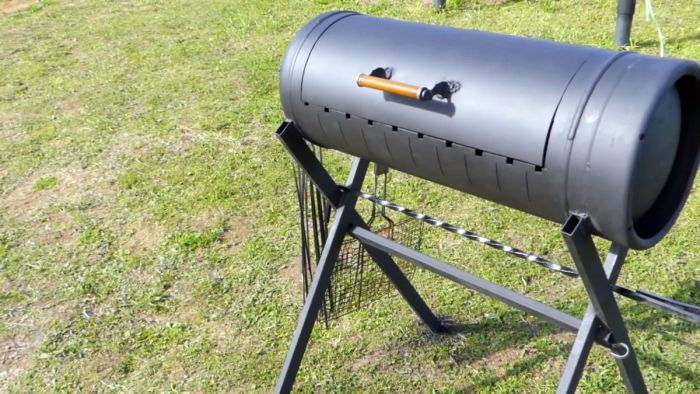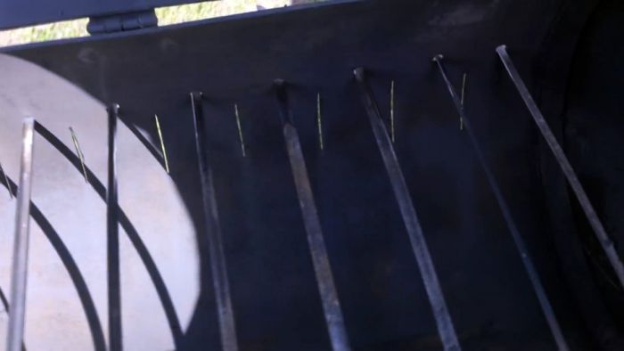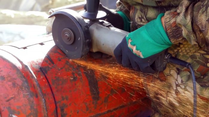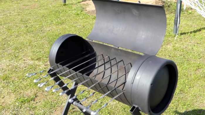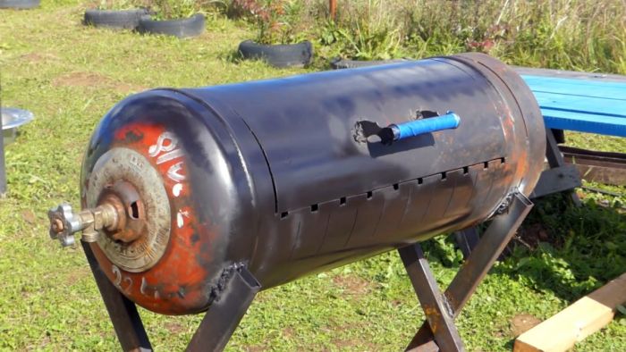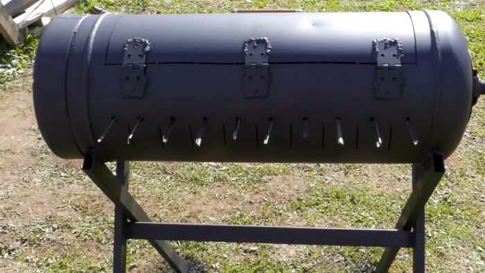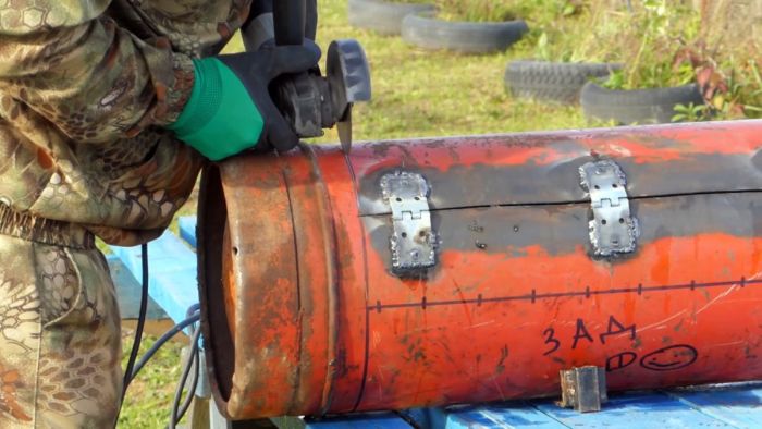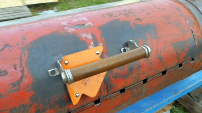 По центру дверцы приваривается ручка из стойкого к высокой температуре материала. Также нужно сделать болгаркой на боковых стенках мангала поперечные пропилы, необходимые для доступа воздуха к углям при закрывании крышки.