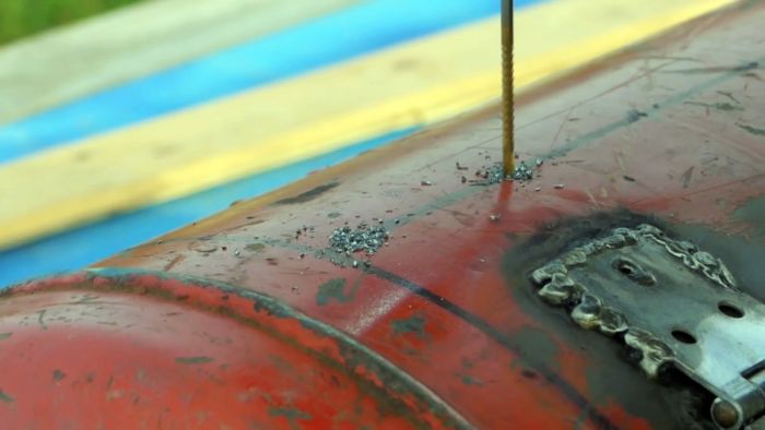 Затем на оставшейся на баллоне линии нужно просверлить отверстия по меткам. Они рассверливаются под ширину шампуров.