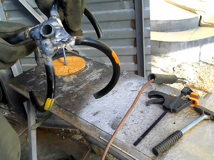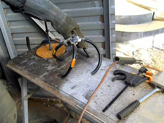 Далее нужно взять небольшой отрезок трубы и приварить к нему заготовки из пружины.