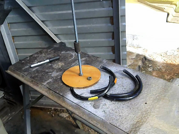 Для этого следует предварительно собрать кондуктор для позиционирования деталей. Он состоит из фанерного диска со шпилькой по центру. На шпильку накручивается гайка, и сверху надевается отрезок трубки. После этого к нему приставляются витки пружины, выравниваются и привариваются.