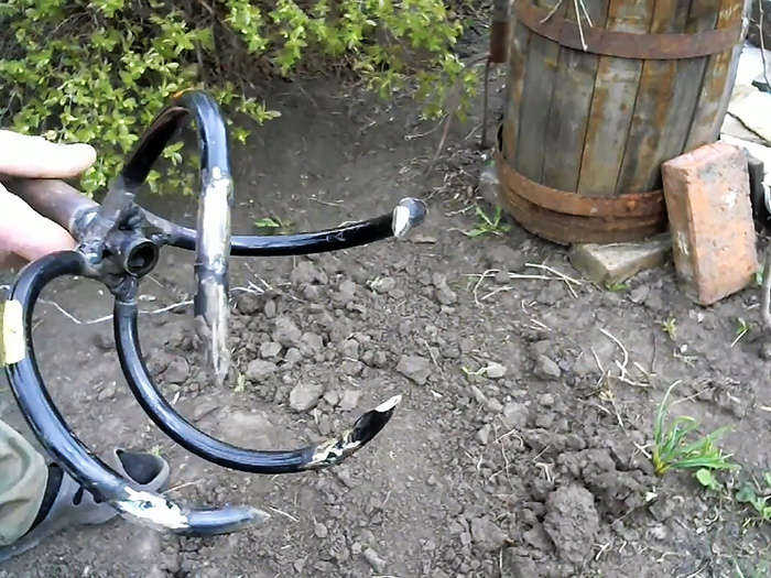 Конструкция культиватора напоминает ручной бур, вместо ножа в котором используются 4 завитые прута. Они направлены таким образом, что при вращении устройство врезалось в грунт. Проще и надежней всего сделать эти прутки с пружины подвески легкового автомобиля. Можно найти 2 лопнувшие пружины на металлоломе или купить 1 целую на авторазборке, тогда самоделка обойдется крайне дешево. Из центральной части пружины вырезается 4 витка одинаковой длины. Края пружины имеют другой диаметр, поэтому из них заготовки не делаются.