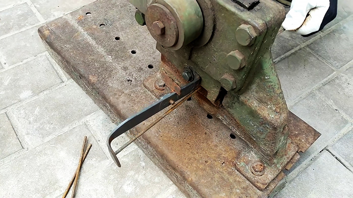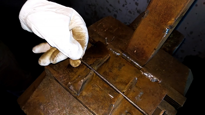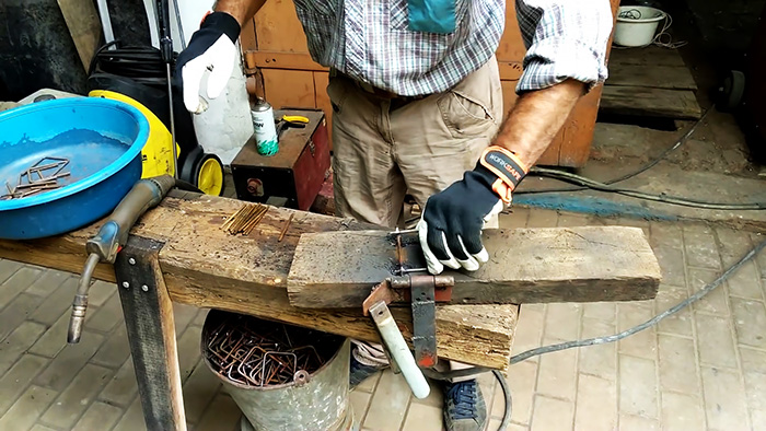Затем к скобам приваривается короткая поперечина из такой же проволоки. Все это можно гнуть в тисках, а при массовом изготовлении столбиков сконструировать гибочный станок для быстрой подготовки хомутов. Размер таких рамок делается на 2-3 см короче, чем сечение желаемого столбика. Обычно для сада используют столбы 80х80 мм, поэтому можно делать хомуты 60х60 мм.