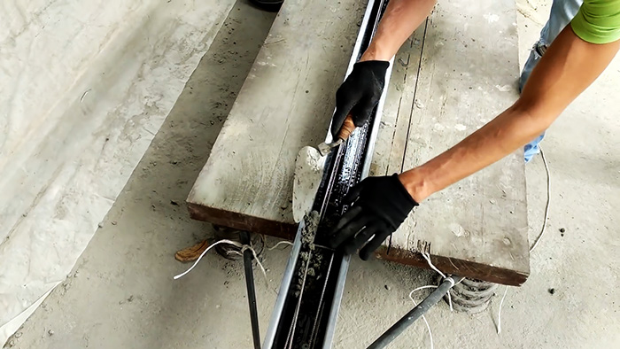 Оптимально уложить ее на вибростол, что сделает столбик более плотным. Если его нет, то форму нужно встряхивать. Раствор можно просто засыпать кельмой или сделать под форму воронку. Бетон приглаживается кельмой, и спустя пару минут форма переворачивается на полиэтиленовую подложку. Чтобы сгладить большие рытвины и микротрещины столбик следует обработать малярной кисточкой.