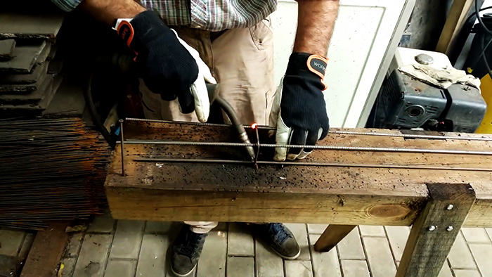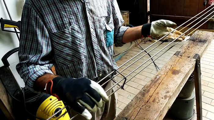 Затем берется 4 прута арматуры диаметром 5-8 мм. На их пучок надевается 3 хомута. Нужно расположить каждую нитку арматуры по углам хомутов и приварить. Если нет сварки, то рамки можно гнуть из одного прутка, а потом привязывать к ним арматуру вязальной проволокой. Хомуты привариваются или привязываются по краям с небольшим отступом и в центре.
