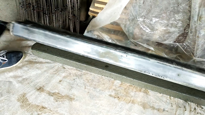 Перед заливкой бетона нужно смазать форму специальным составом или смесью солярки с маслом. Сама форма может быть покупной пластиковой или самодельной согнутой и сваренной из листового металла. Также ее можно изготовить из дерева. Каркас из арматуры закладывается в форму. По хомутам подбрасывается небольшое количество раствора, чтобы выровнять арматуру относительно формы.