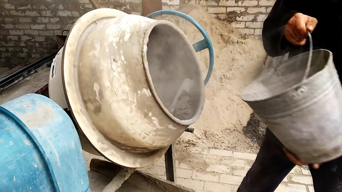Далее подготавливается бетон. В его состав входит: 3 части щебня, 2 части песка, 1 часть цемента. Вода добавляется по ситуации, в зависимости от влажности песка. Также в состав вносится пластификатор для бетона. Его количество указывается производителем. Если добавлять все компоненты ведрами, то пластификатора уйдет 100-150 гр. Полученный бетон должен лепиться в комок как глина.
