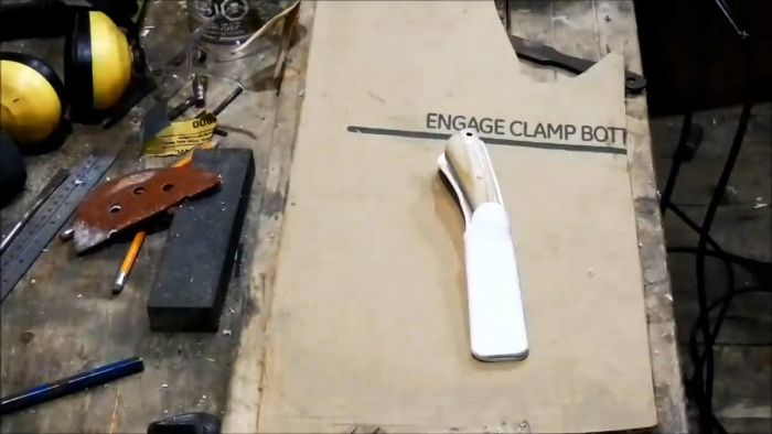 Затем лопатка в месте пропилов прогревается феном и в петлю вставляется любая полоса подходящего размера. Когда петля застынет и примет форму в нее можно будет легко заводить поясной ремень.