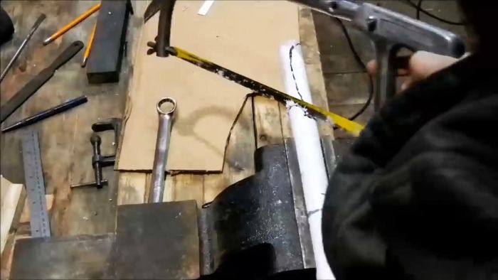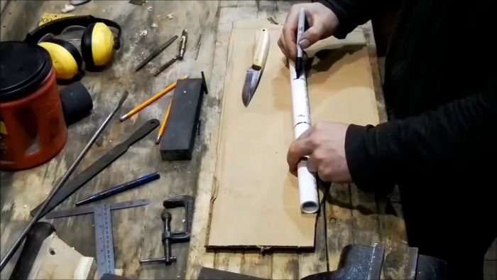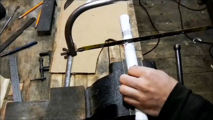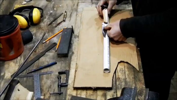 Выбрав трубку подходящего диаметра под ширину клинка нужно отрезать от нее заготовку. Для этого нож прикладывается к ней так, чтобы его рукоять выступала на 10-20 мм за край.
