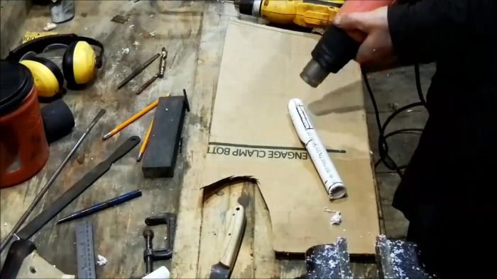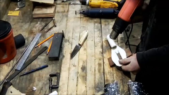 Затем феном прогревается вторая половина трубки и в нее вставляется клинок ножа. Сразу после этого ее нужно придавить, чтобы она прижалась к лезвию. Для этого трубка прикладывается к краю столешницы и сдавливается обрезком доски. Деформация выполняется в несколько подходов, пока ножны полностью не примут форму клинка.